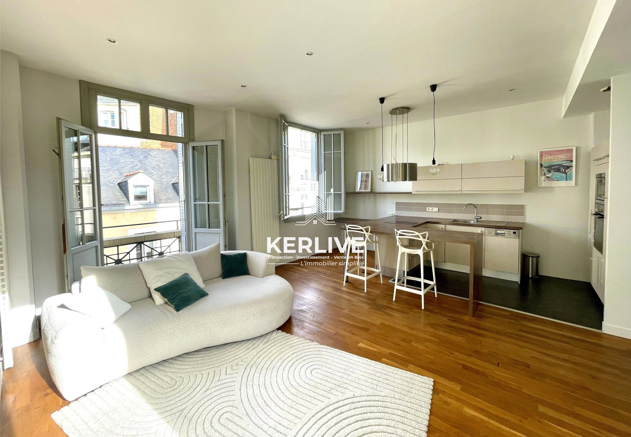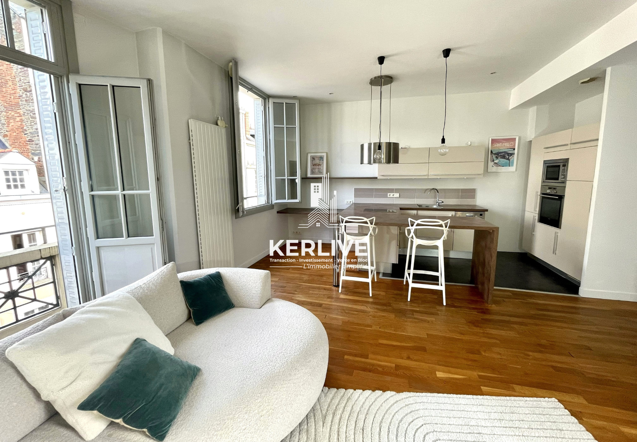 KERLIVE est ravie de vous présenter ce splendide appartement de type 2 pièces (51 m²), occupant l’intégralité du 3ᵉ étage d’un immeuble de 4 étages, récemment ravalé, situé entre La Place de Bretagne et La Criée, l’un des quartiers les plus recherchés de Rennes.