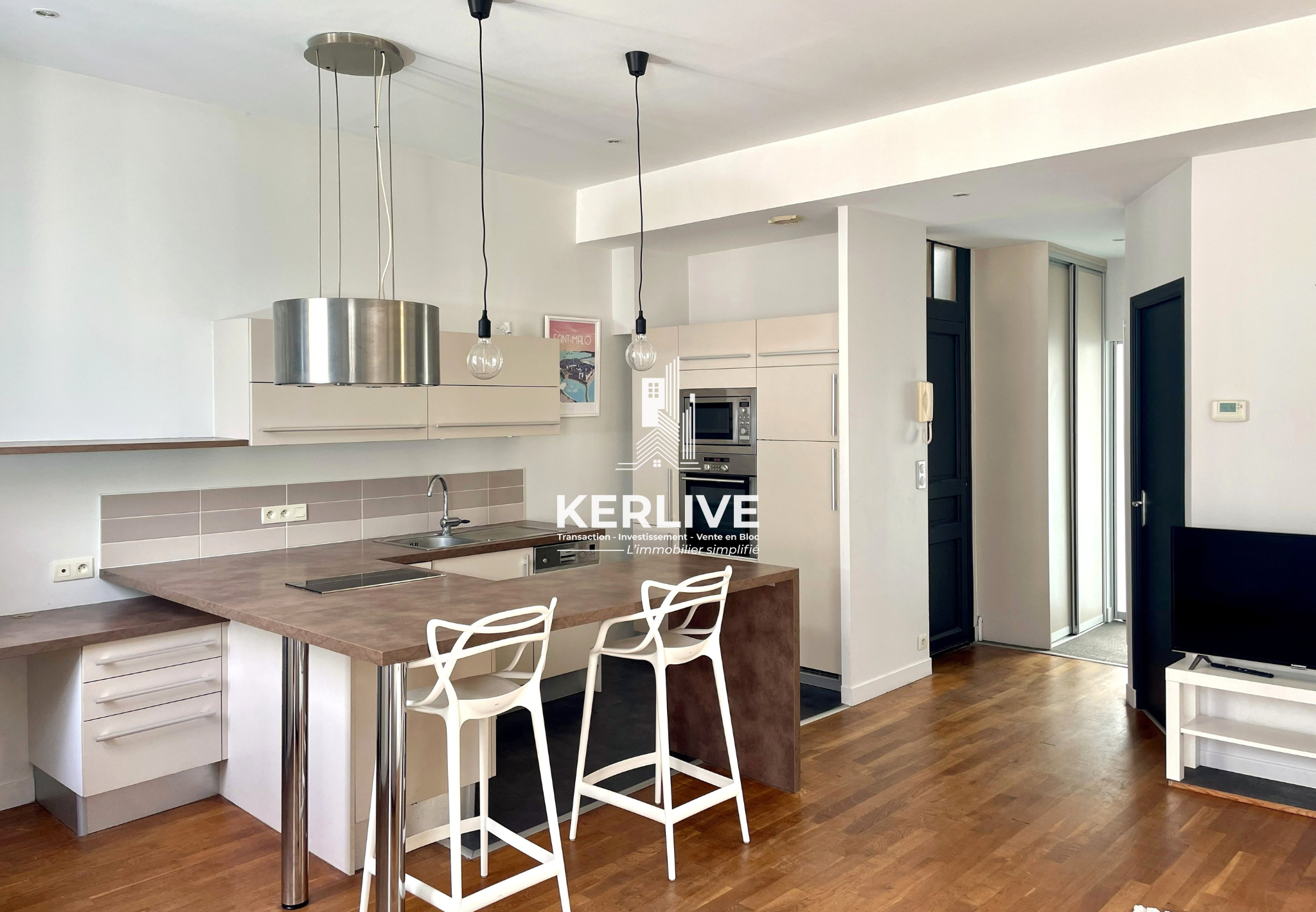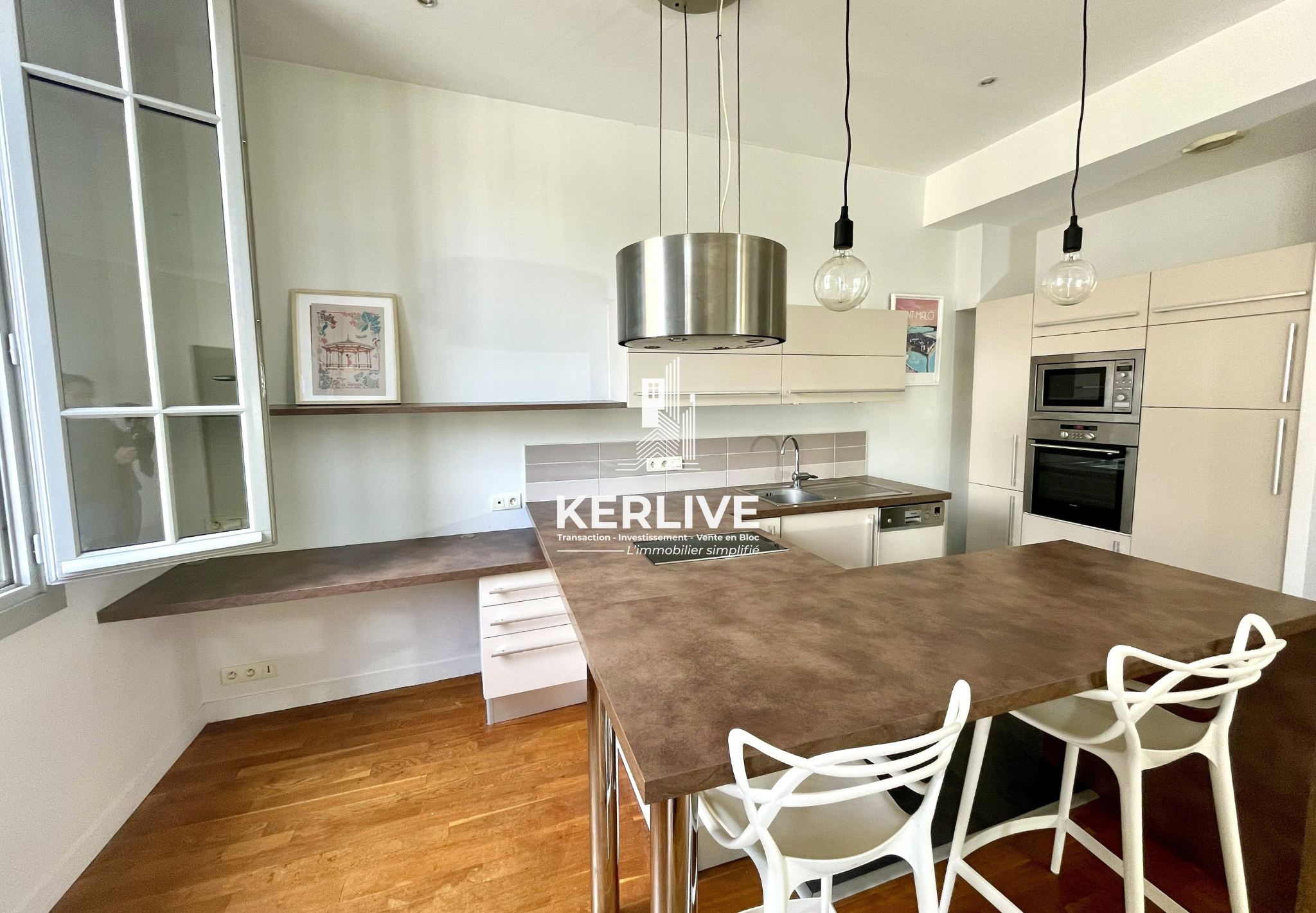Dès l’entrée, le vaste séjour impressionne par ses volumes ouverts, sa lumière naturelle omniprésente grâce à son exposition traversante et par son ouverture sur un extérieur. La cuisine américaine est entièrement équipée et aménagée, pensée pour allier esthétisme et praticité.